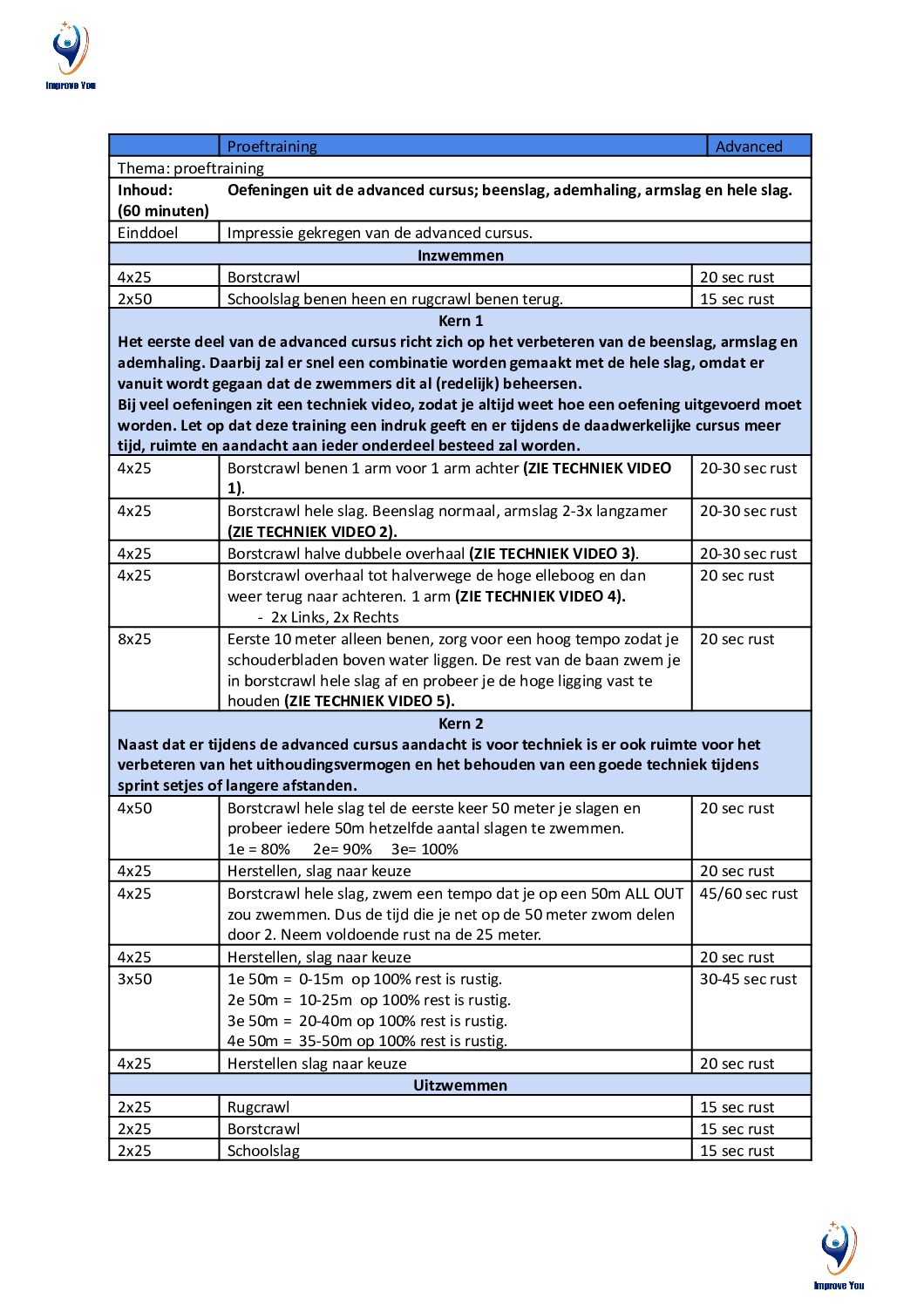 De training volgen zal al goed en genoeg zijn, maar voel je vooral vrij een eigen draai te geven. Doe oefeningen die uitdagend zijn opnieuw of doe oefeningen die je leuk vond vaker. Als je merkt dat een oefening voor jou goed werkt, mag je deze altijd integereren in een van je toekomstige trainingen. Gebruik de trainingen om beter te worden, maar probeer ook te genieten van het zwemmen.
