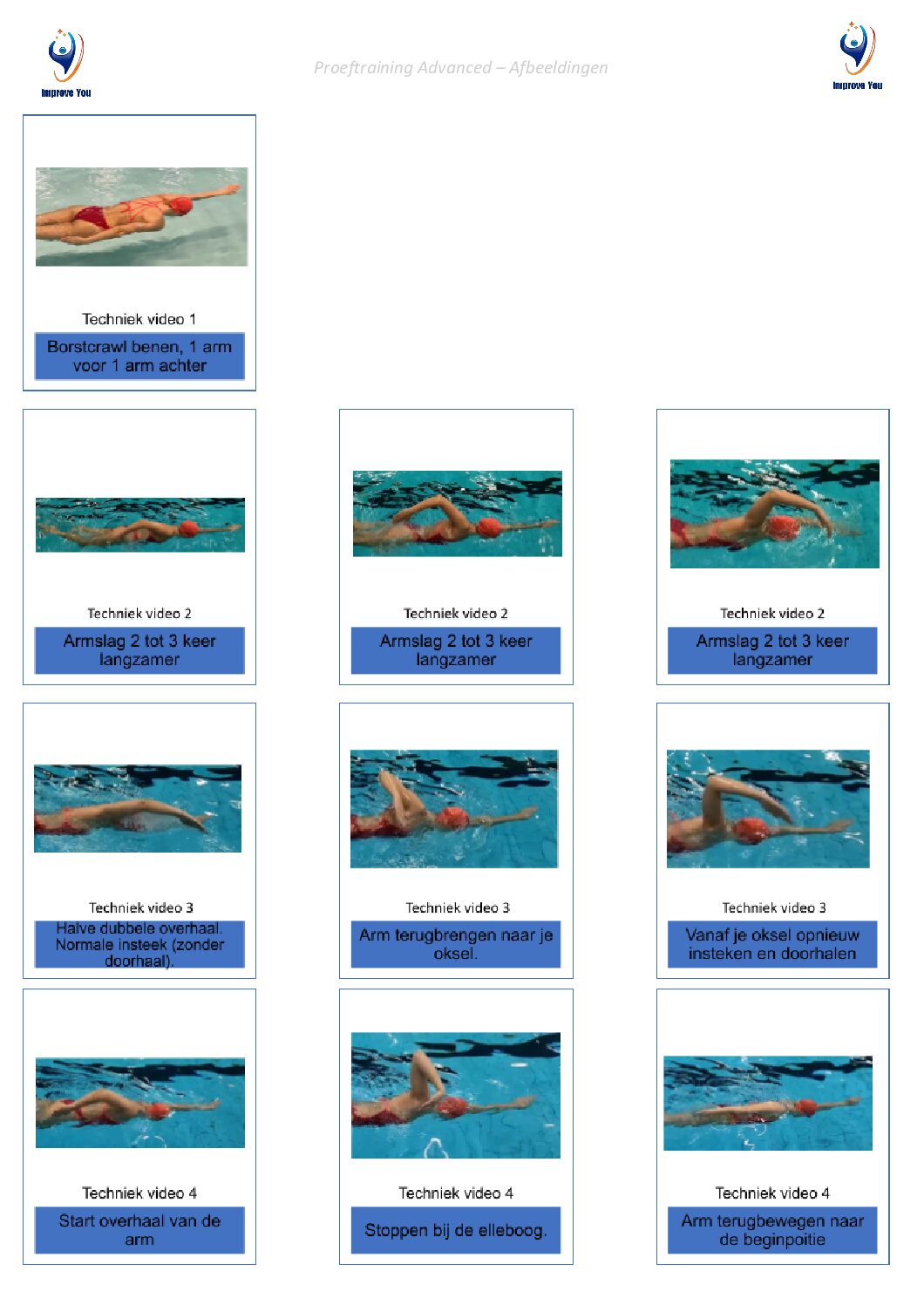Pak een training en bekijk de instructie video die er bij hoort. Geen zorgen, de filmpjes zijn niet ontzettend lang. Je kan een training downloaden, printen en meenemen. Heb je een geheugensteuntje nodig voor opdrachten? Er zijn ook afbeeldingen die je mee kan nemen in plaats van dat je filmpjes hoeft te kijken in het water. Zo kun je met de training aan de slag gaan.